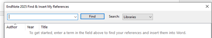 4. EndNote 2025 Find & Insert My References box will open. Use keywords/author name to search for the citation you want to use.